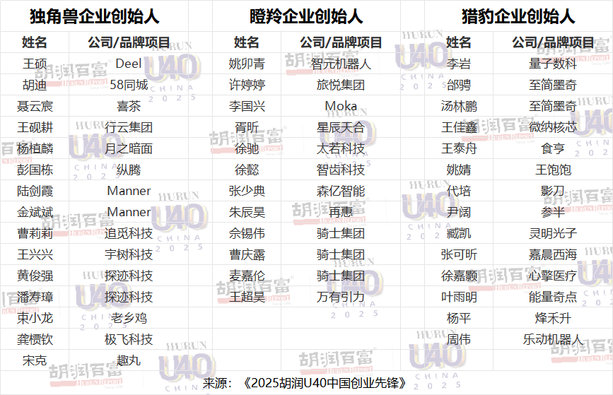 “‘胡润U系’2017年从中国U30起头,本年已是我们推出中国U40创业前锋榜单的第三年。2023年,我们发觉了米哈逛的蔡浩宇、刘伟和罗宇皓、快手的程一笑、茶百道的王霄锟、希音的许仰天等182位U40创业前锋;2024年,我们找到了影石科技的康、滴滴从动驾驶的张博、哔哩哔哩的徐逸、小红书的毛文超、M Stand的葛东、古茗奶茶的王云安等153位U40创业前锋。本年,我们找到了195位。我们期望这份榜单能为入选者搭建优良资本对接桥梁,帮帮他们获得投资者的关心、处所的支撑,以及计谋合做伙伴资本,帮力他们加快成长、走得更远;同时也但愿这份榜单能激励下一波怀揣胡想的U40,正在创业之上果断前行。”。
