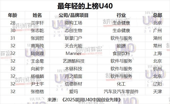 “本年上榜的U40创业前锋,平均正在28岁时开办了他们的企业,此中最年轻的创业者是前沿合成生物手艺企业微构工厂的兰宇轩,他创业时才24岁。兰宇轩还曾入选2021胡润U30、2024胡润U35。”。