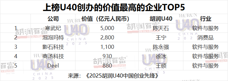39位小我财富50亿元及以上的U40企业家进入《2025 胡润中国U40企业家榜》。企业估值增加五倍以上,才能第二次登上胡润U40创业前锋榜单,如泡泡玛特的王宁和寒武纪的陈天石。