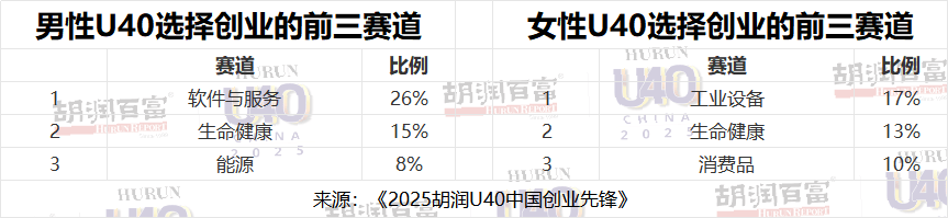 男性U40青睐的前三赛道是软件取办事、生命健康、能源。女性U40青睐的前三赛道是工业设备、生命健康、消费品。