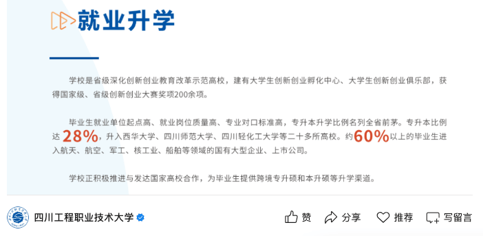提起职业本科,良多考生和家长可能城市认为目前正在社会承认度方面,不成否定,正在部门省市区这确实是一个现实,只是我们也不克不及轻忽的一个现实是,当前良多职业本科高校就业质量要比大大都通俗公办本科都要好。就以最新的就业数据为例,铁道职业手艺大学2024届结业生有56。26%都是正在全国铁局就业,再加长进入铁工程局的,保守估量国企就业率是正在60%以上。四川工程职业手艺大学则是有60%以上的结业生都能进入航空、航天、军工、核工业、船舶等范畴的国有大型企业和上市公司工做。