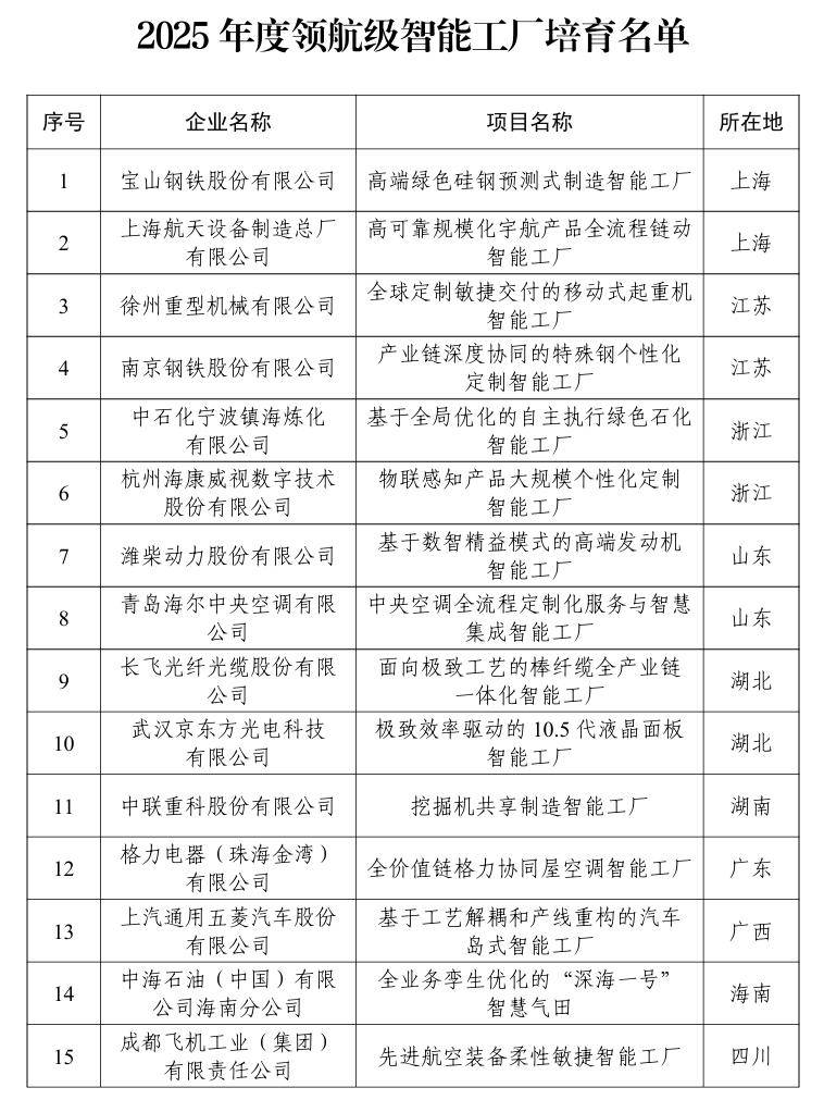 企业名称项目名称所正在地宝山钢铁股份无限公司高端绿色硅钢预测式制制智能工场上海上海航天设备制制总厂无限公司高靠得住规模化宇航产物全流程链动智能工场上海徐州沉型机械无限公司全球定制火速交付的挪动式起沉机智能工场江苏南京钢铁股份无限公司财产链深度协同的特殊钢个性化定制智能工场江苏中石化宁波镇海炼化无限公司基于全局优化的自从施行绿色石化智能工场浙江杭州海康威视数字手艺股份无限公司物联产物大规模个性化定制智能工场浙江潍柴动力股份无限公司基于数智精益模式的高端策动机智能工场山东青岛海尔地方空调无限公司地方空调全流程定制化办事取聪慧集成智能工场山东长飞光纤光缆股份无限公司面向极致工艺的棒纤缆全财产链一体化智能工场湖北武汉京东方光电科技无限公司极致效率驱动的 10。5 代液晶面板智能工场湖北中联沉科股份无限公司挖掘机共享制制智能工场湖南格力电器(珠海金湾)无限公司全价值链格力协同屋空调智能工场广东上汽通用五菱汽车股份无限公司基于工艺解耦和产线沉构的汽车岛式智能工场广西中海石油(中国)无限公司海南分公司全营业孪生优化的“深海一号”聪慧气田海南成都飞机工业(集团)无限义务公司先辈航空配备柔性火速智能工场四川