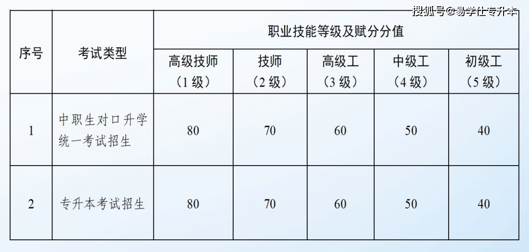 6。技术赋分。专科阶段获得的职业技术竞赛项、职业技术品级2个项目,将通过赋分体例转换每个项目标成就。该成就计入专升本测验总成就,且2个项目成就可累加计较。考生取得的职业技术竞赛获项目、职业技术品级,须取报考的测验类别相关方可赋分。