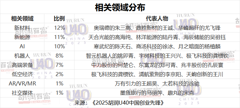 上榜U40创业前锋中,涉及新材料范畴的占比12%,新能源11%,AI范畴10%,机械人8%,高端配备7%,低空经济2%,AR/VR/MR和社交均占1%。