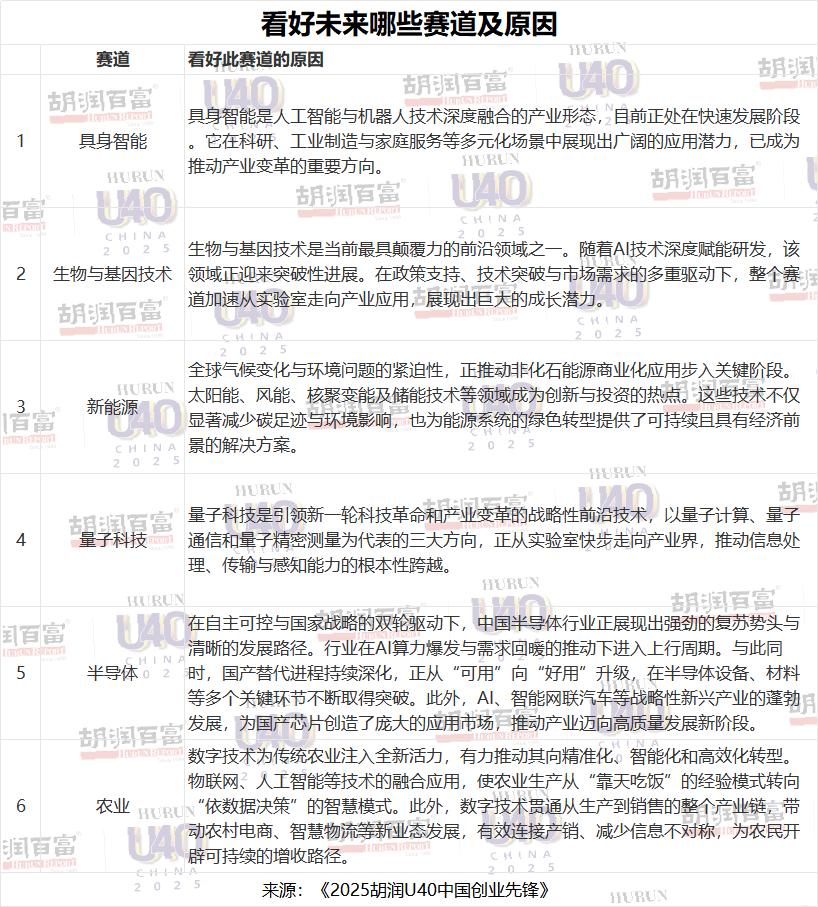 “本年上榜的U40创业前锋,平均正在28岁时开办了他们的企业,此中最年轻的创业者是前沿合成生物手艺企业微构工厂的兰宇轩,他创业时才24岁。兰宇轩还曾入选2021胡润U30、2024胡润U35。”。