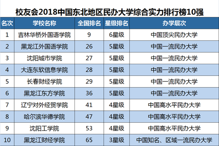 正在最新校友会2018中国平易近办大学排行榜150强中,华桥外国语学院、外国语学院、大连东软消息学院、长春财院、东方学院、辽宁对外经贸学院、华德学院、沈阳工学院、财院名列校友会2018东北地域平易近办大学分析实力排行榜前10强。武昌首义学院位居校友会2018中国平易近办大学排行榜榜首,文华学院第2,山东英才学院第3,西安欧亚学院第4,三亚学院第5,山东协和学院第6,郑州工商学院第7,武汉学院第8,西安培华学院和华桥外国语学院并列第9。