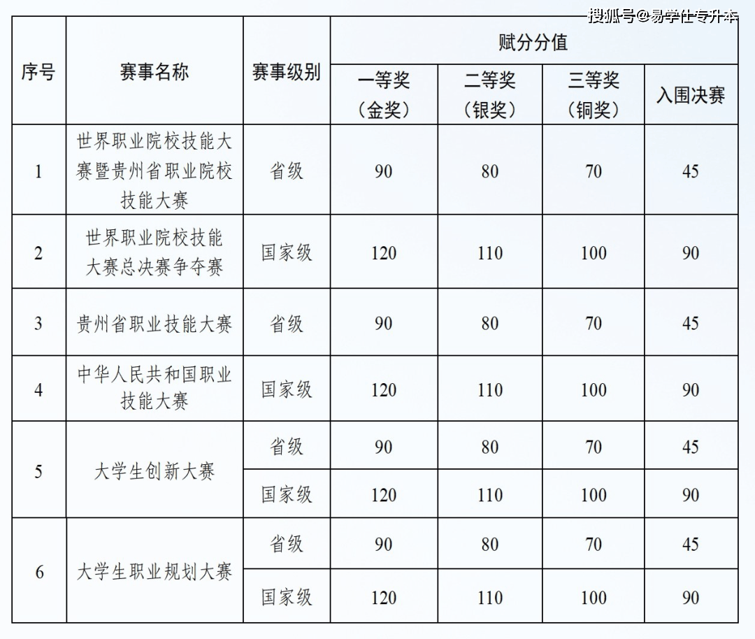 6。技术赋分。专科阶段获得的职业技术竞赛项、职业技术品级2个项目,将通过赋分体例转换每个项目标成就。该成就计入专升本测验总成就,且2个项目成就可累加计较。考生取得的职业技术竞赛获项目、职业技术品级,须取报考的测验类别相关方可赋分。